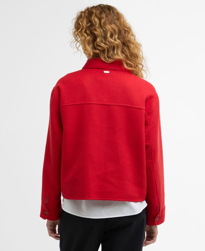 Die Overshirt-Jacke für Damen ist ein praktisches Kleidungsstück, das Hemd und leichte Jacke vereint. Dieses leuchtend rote Modell hat einen kürzeren Schnitt und besteht aus einem zweilagigen Material, dessen Außenseite aus einer Wollmischung gefertigt ist, die schön wärmt, ohne zu stark zu wärmen.