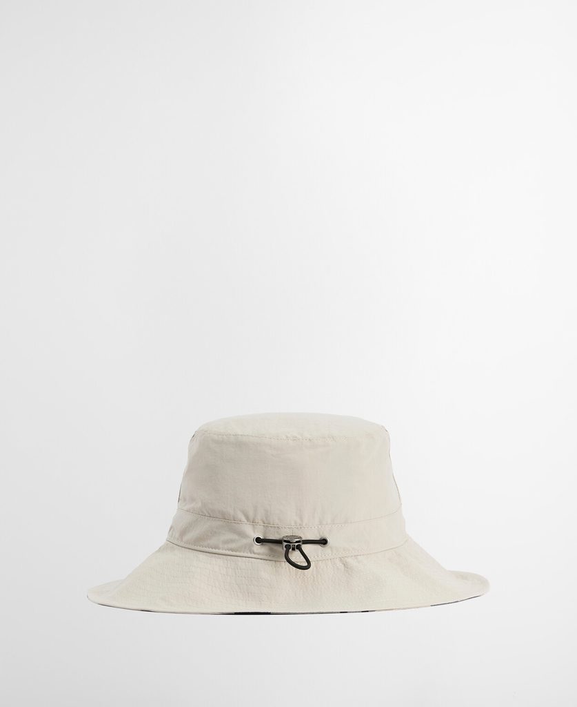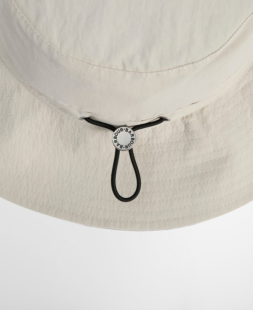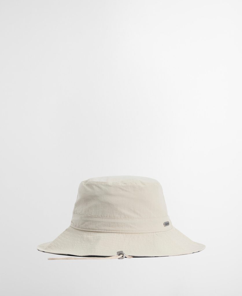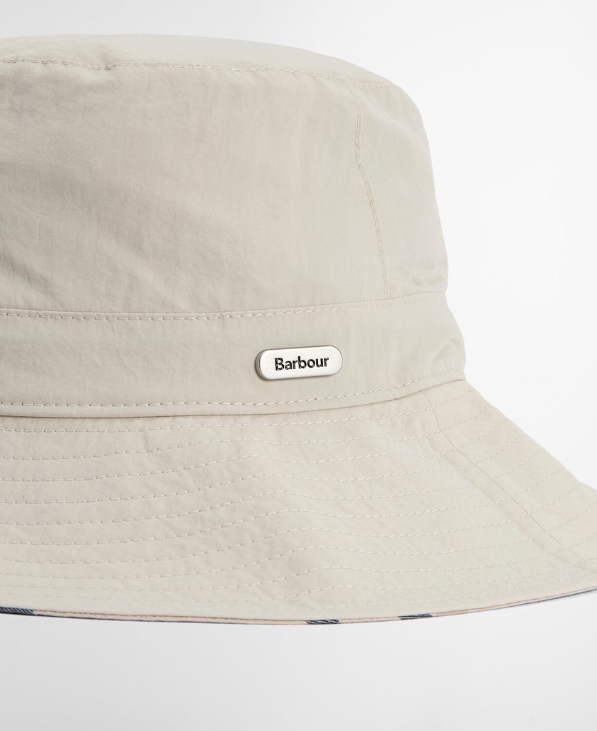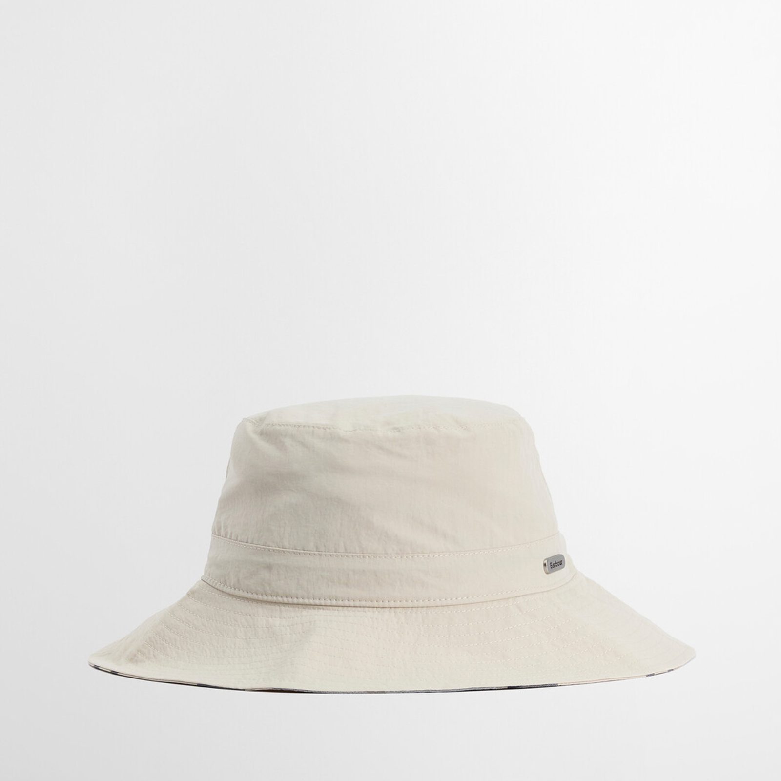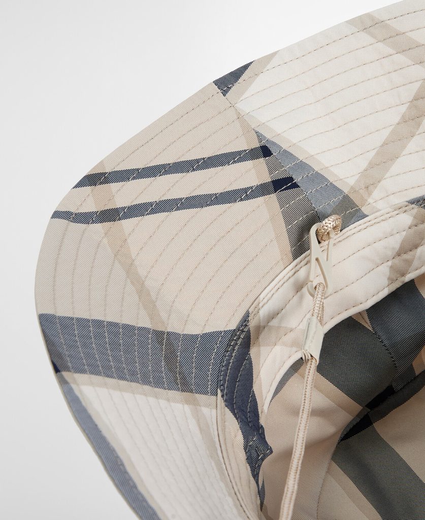 Damen-Bucket-Hat (auf Deutsch kurz „Hütchen“) aus leichtem Stoff mit einer Polyurethan-Beschichtung, damit er bei jedem Wetter getragen werden kann. Das Futter ist mit einem Tartanmuster versehen, unter dem Kinn befindet sich ein verstellbares (und abnehmbares!) Band.