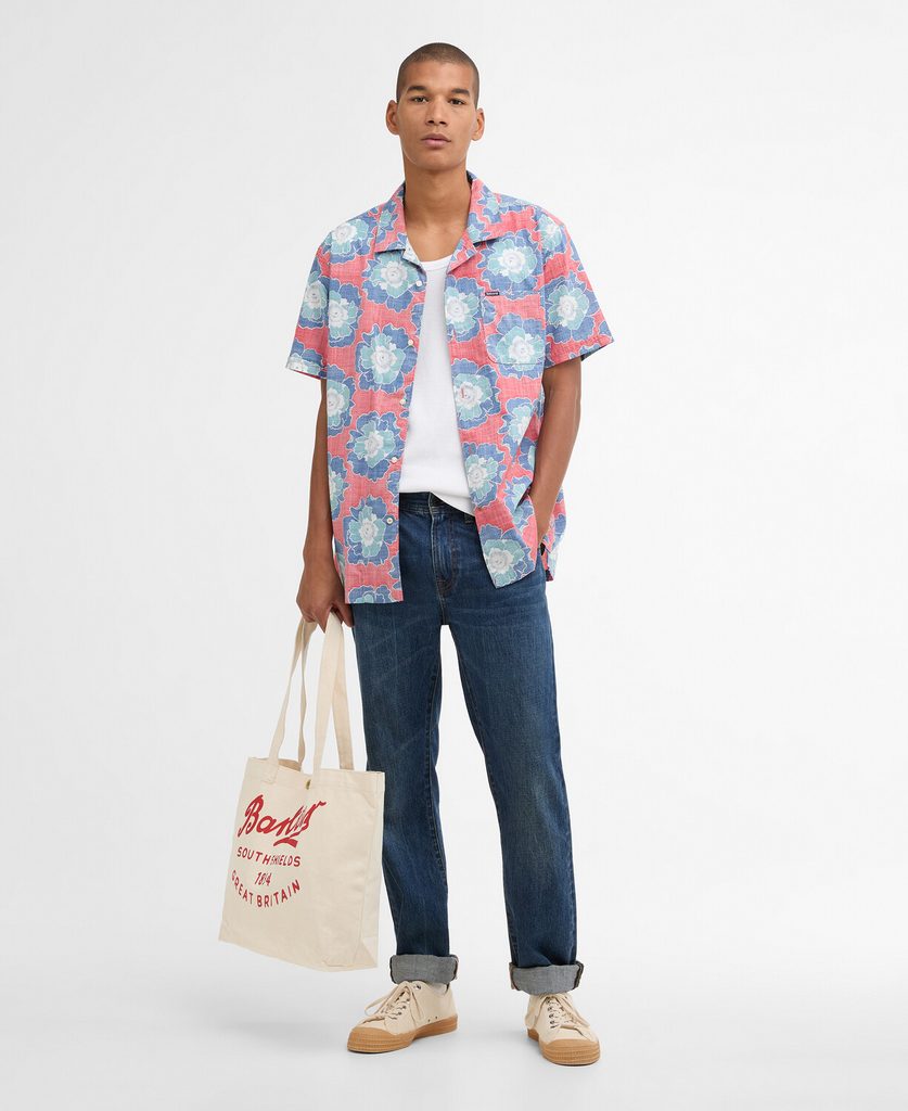 Ein Kurzarmhemd mit großflächigem Blumenmuster, das auf die Rückseite des Stoffes gedruckt ist, sodass die Farben von außen sanft und ein wenig verblasst wirken – als hätte es schon einige Saisons in der Sonne verbracht. Da es sich um ein Sommermodell handelt, erwarten Sie einen flachen Kragen, kurze Ärmel und einen lockeren Schnitt, damit alles so gut wie möglich luftig bleibt.