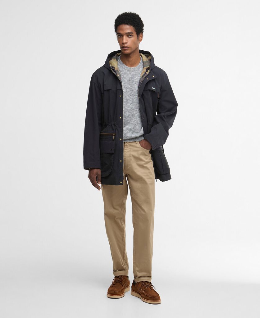 Die Durham-Jacke ist eine etwas längere und robustere Variante der Bedale-Jacke und wurde ursprünglich als Arbeitsjacke mit Kapuze entworfen. Die neue Version in der Icons-Edition übernimmt die ursprüngliche Silhouette und den Schnitt, ersetzt jedoch die gewachste Baumwolle durch einen vielseitigeren Baumwollmix mit gebürsteter Oberfläche. Die feste Kapuze ist mit Tartan gefüttert, der beim Aufsetzen dezent sichtbar ist.
