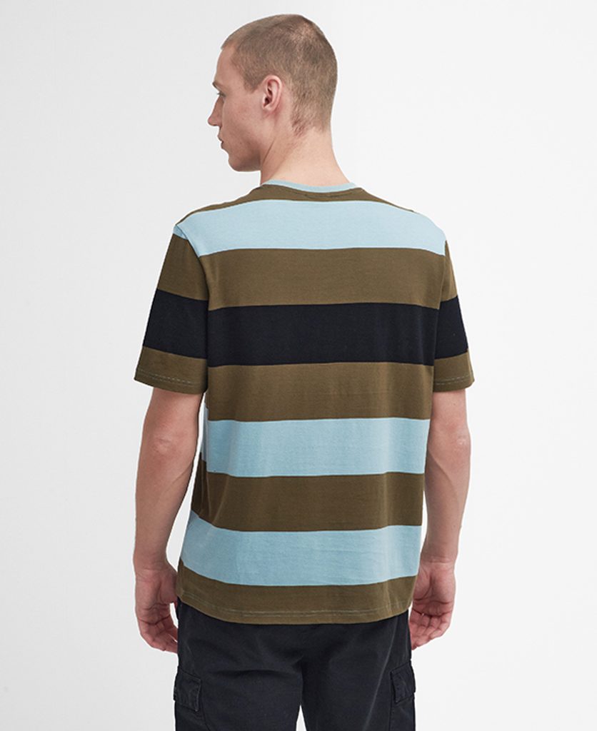 Ungewöhnliche T-Shirts sind bereits ein Evergreen in der Streetwear-Linie der legendären Marke Barbour. Dieses T-Shirt ist in drei Farben gestreift: braun, hellblau und schwarz in der Mitte. Es hat eine lockere Passform und ist aus 100 % Baumwolle in Jersey-Bindung und einem dickeren Wintergewicht von 180 g/m2 gefertigt.
