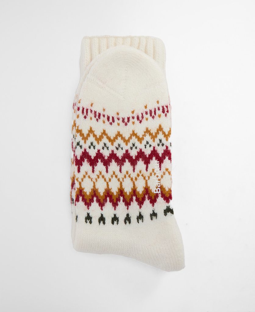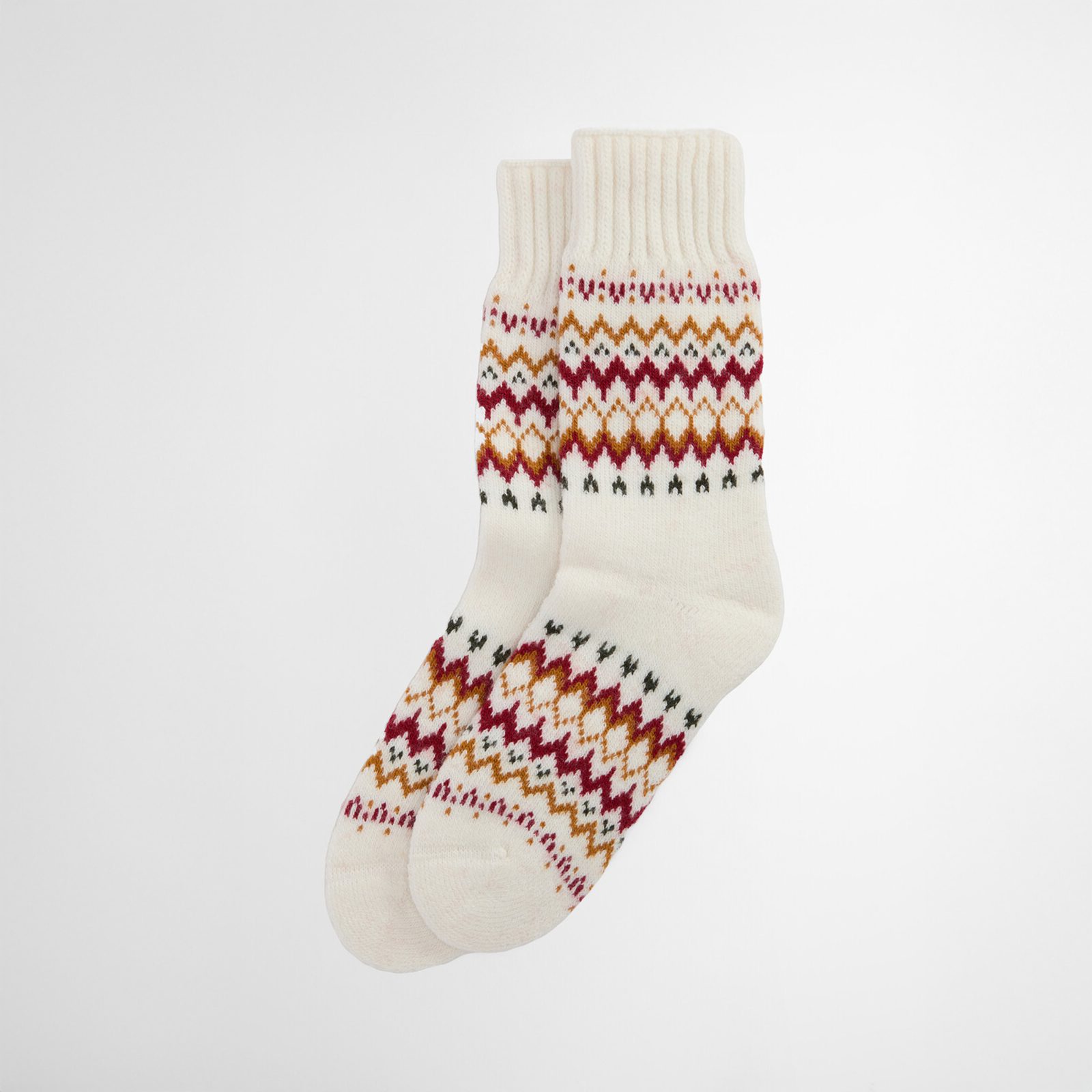 Damensocken in zartem Weiß/Off-White mit traditionellem schottischem Muster in warmen Rot- und Orangetönen. Wir empfehlen, sie mit einem brennenden Kamin (aber nicht direkt) und einem Dackel auf dem Schoß zu kombinieren, um das allgemeine seelische Wohlbefinden zu steigern.