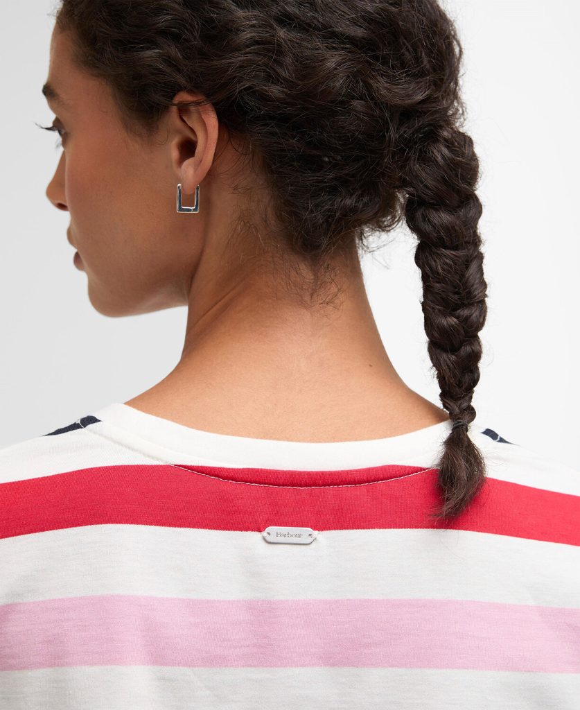 Damen-T-Shirt aus Baumwolle mit mehrfarbigem Streifenmuster von Barbour. Es hat einen lockeren Schnitt, umgeschlagene Ärmelbündchen und kleine Seitenschlitze, sodass es natürlich sitzt und nicht einengt. Hergestellt aus 100 % Baumwolle, angenehm zu tragen im Sommer und unter einer leichten Jacke, zu Jeans oder einem Rock.