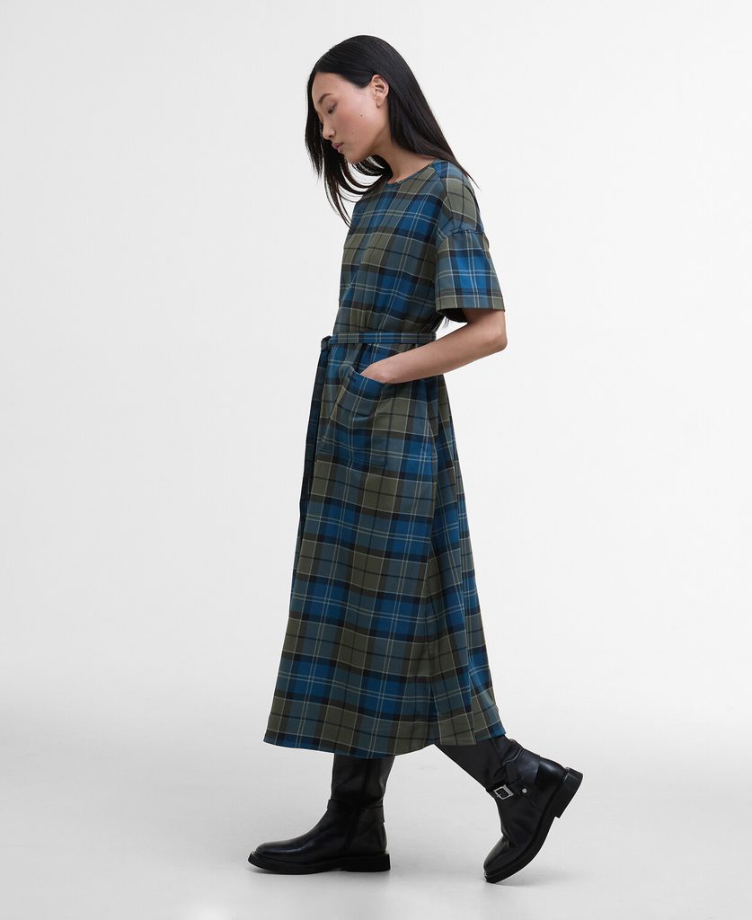 Maxikleid mit leicht ländlichem Touch und typisch britischem Tartanmuster. Es ist im Maxischnitt geschnitten, d. h. reicht fast bis zu den Knöcheln, wird an der Taille gebunden und hat zwei Taschen – ein äußerst praktischer Trick. Ergänzt durch kurze Ärmel für einen noch moderneren Look.