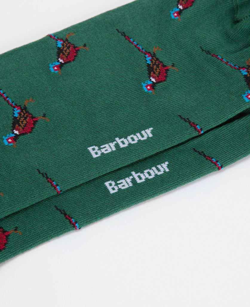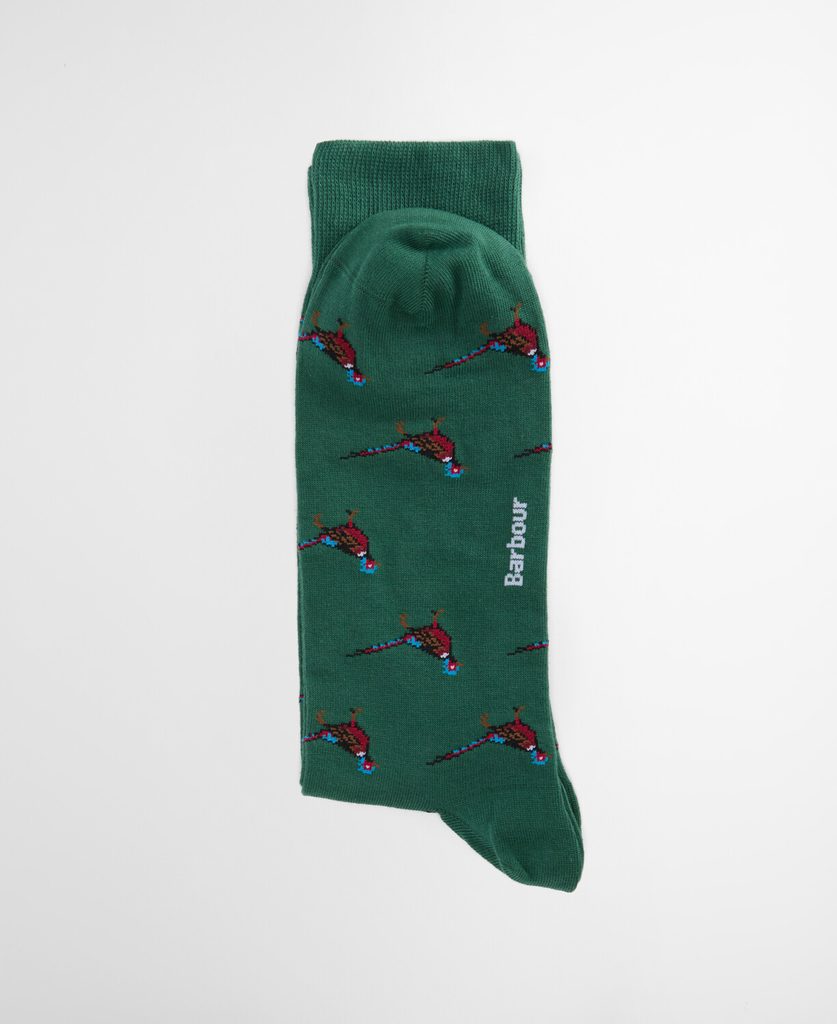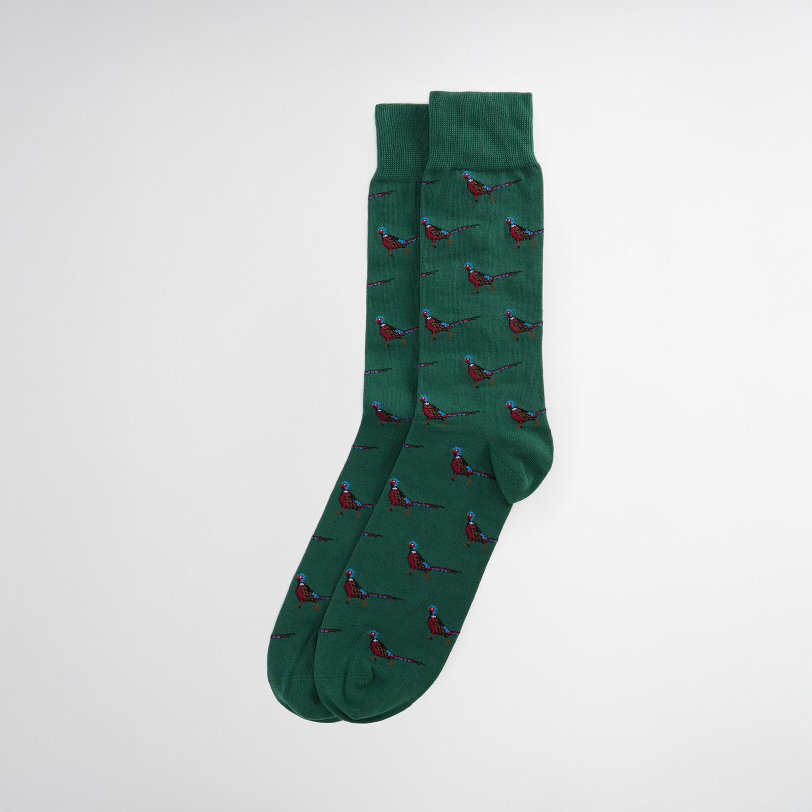 Einfarbige Socken, die jedoch auf frische Weise mit einem Tiermotiv verziert sind: diese hier mit traditionellen ländlichen Fasanen.