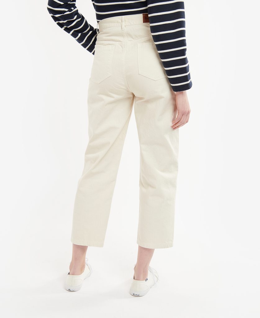 Locker geschnittene Jeans in klassischem Blau und der weniger häufigen Farbe Weiß. Es handelt sich um so genannte "barrel-leg"-Jeans, das heißt, sie sind am Knie am weitesten - sie sind weder gerade geschnitten, noch haben sie einen Schlag oder es sind carrot jeans. Kurz gesagt, irgendetwas dazwischen, was man gerne anzieht. Dazu noch vordere funktionelle Taschen und ein paar Gürtelschlaufen, und schon hat man eine coole und flexible Hose.