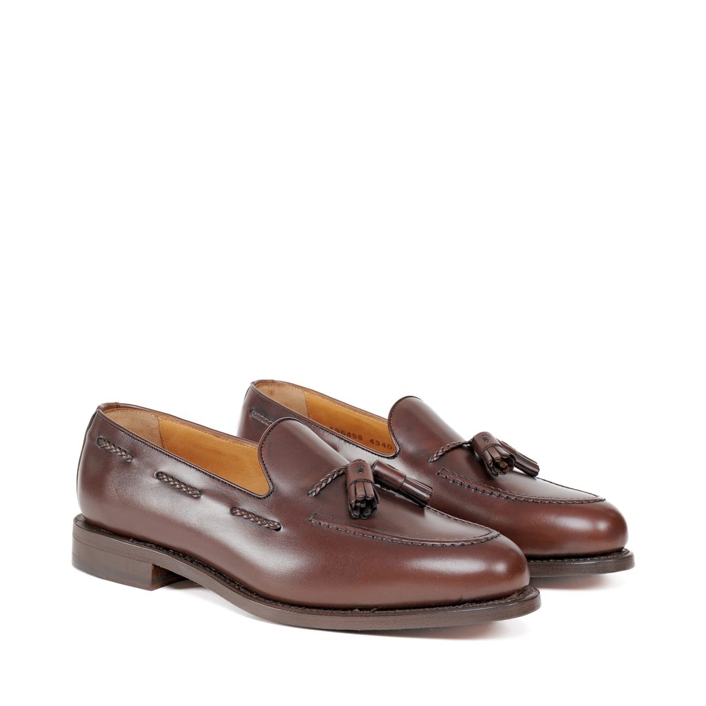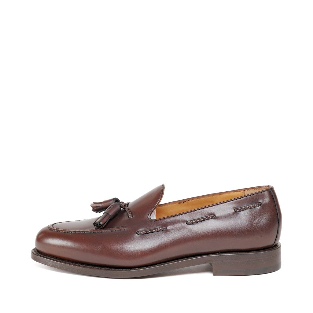 Diese klassischen braunen Tassel Loafers, also Slipper mit Quasten, verbinden Lässigkeit mit dezenter Eleganz. Sie sind aus erstklassigem, glattem Kalbsleder gefertigt, dessen satte Farbe und sanfter Glanz bei jedem Schritt zur Geltung kommen. Typisch für dieses Modell sind die handgeflochtenen Lederbänder mit Quasten sowie die Ziernähte am Spann, die dem Schuh Tiefe und Charakter verleihen.