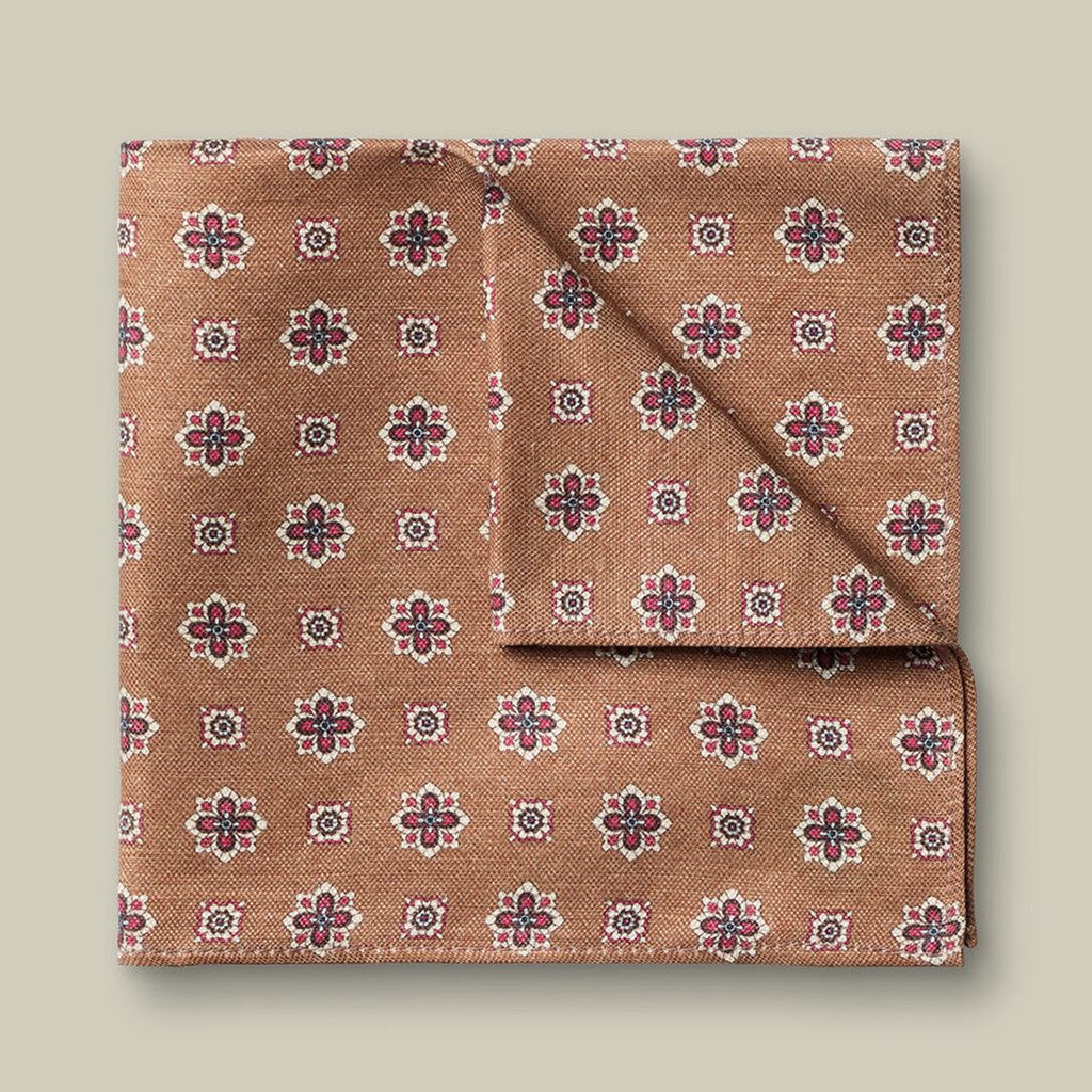 Ein hochwertiges Taschentuch aus einer Mischung aus Leinen und Seide, das sich nicht nur für Sommersakkos eignet und zudem mit einem wunderschönen geometrischen Muster verziert ist.