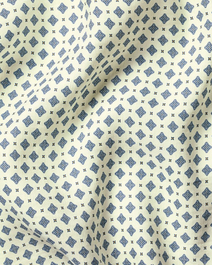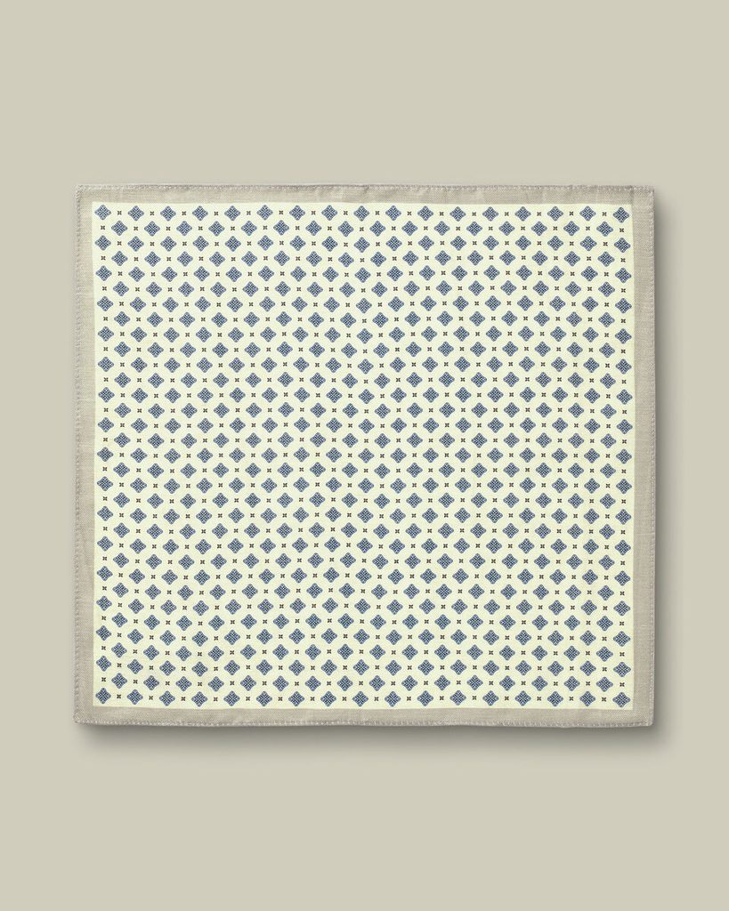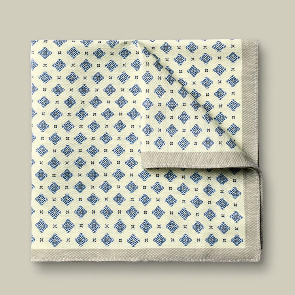 Ein hochwertiges Einstecktuch aus einer Mischung aus Leinen und Seide, das sich nicht nur für Sommersakkos eignet und zudem mit einem wunderschönen geometrischen Muster verziert ist.