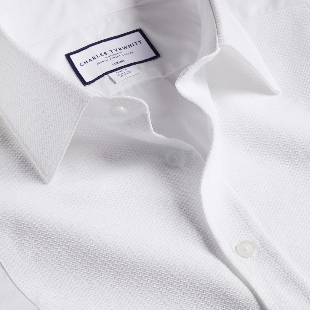 Ein erstklassiges formelles Hemd mit allem, was das Dresscode Black Tie erfordert: strahlend weiße Farbe, lange Ärmel mit Manschettenknöpfen, eine zusätzliche Lage auf der Vorderseite, die in einer Piqué-Struktur (auch als Marcella-Gewebe bekannt) ausgeführt ist. Das Ganze ist aus 100% ägyptischer Baumwolle gefertigt - besser gehts nicht.