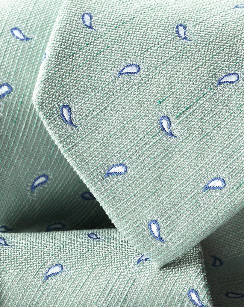 Eine fast schon bezaubernde Krawatte aus einer Mischung aus Seide und Leinen, die in einem modernen, schmaleren Schnitt gefertigt ist – an der breitesten Stelle misst sie nur 6,5 cm (im Vergleich zu üblichen 8 cm) und eignet sich daher am besten zum Tragen mit eng anliegenden Anzügen oder für größere Herren.