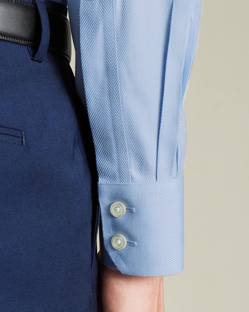 Ein schlichtes hellblaues Hemd, Symbol für legere Formalität. Hier finden wir Klassiker: reine Baumwolle, einen klassischen (vielleicht etwas offeneren, modernen) Kragen und lange Ärmel mit Knopfmanschetten. Besonders erwähnenswert sind jedoch die einzigartige Fischgrätenbindung des Stoffes und die bügelfreie Ausrüstung, die das Hemd zu einem langjährigen – und vor allem beliebten! – Begleiter im Büro macht.