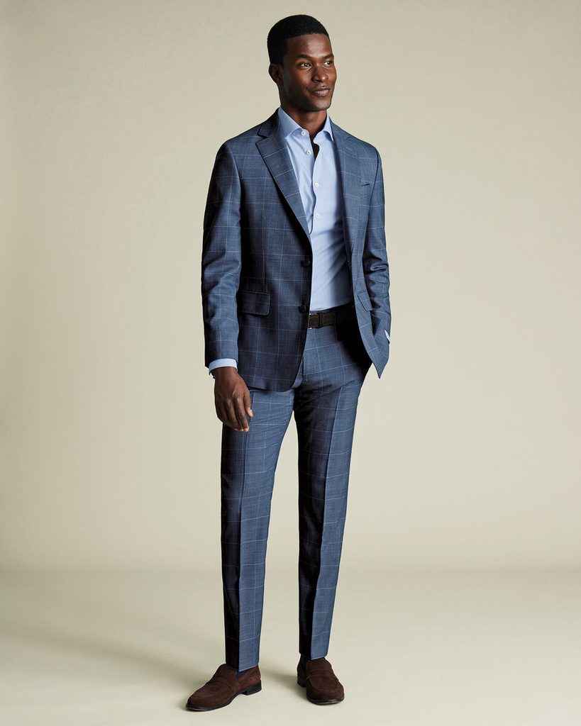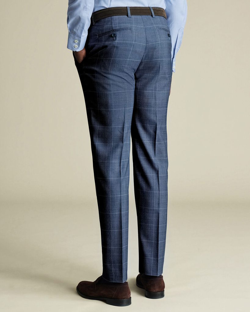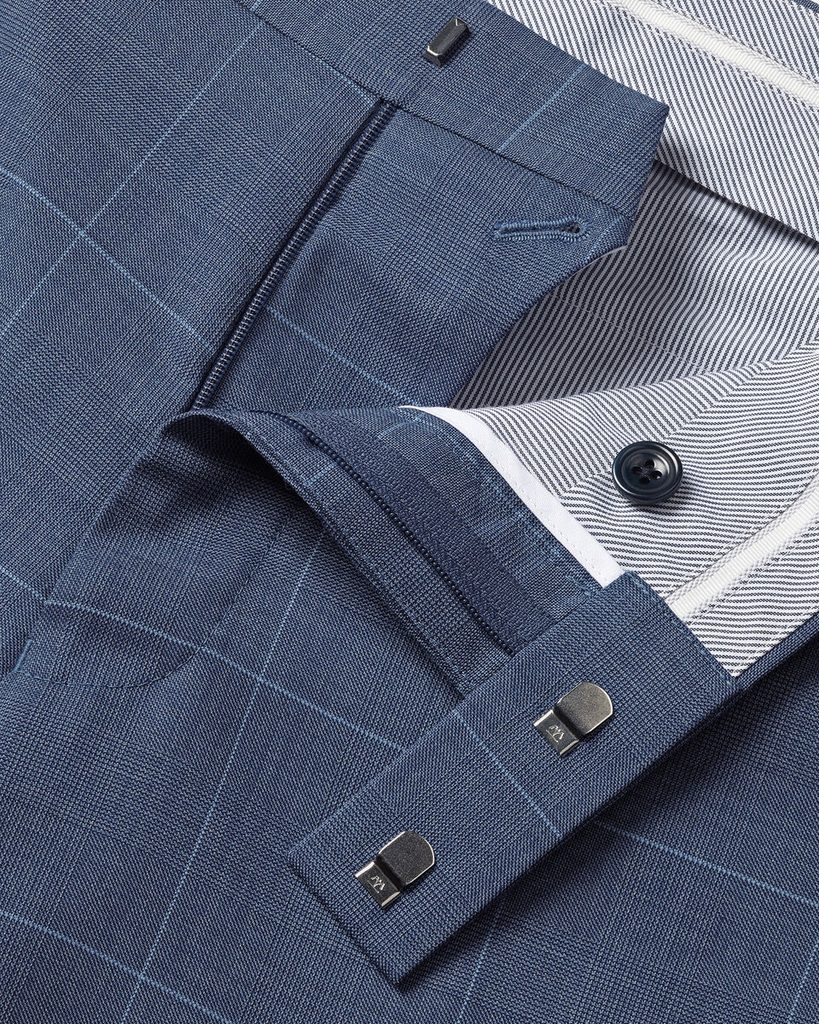 Blau karierte Anzughose der Saison, genäht aus feineren Super 120s Fasern und gepunktetem Birdseye-Gewebe. Ein minimalistisches Kleidungsstück mit einer flachen Vorderseite (die Hose ist also ohne Biesen ) und mit einem knielangen Futter. Verständlicherweise verfügt sie auch über einen typisch formellen französischen Knopfverschluss, d. h. einen Knopf mit einer Überdeckung.