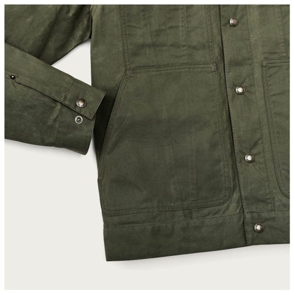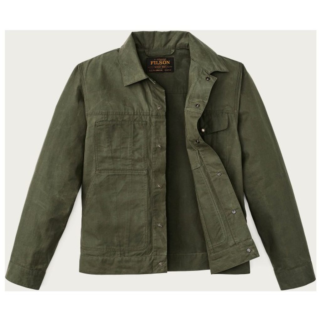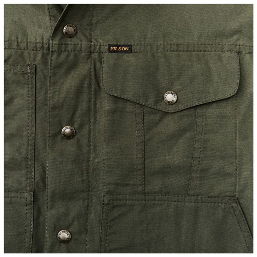 Eine leichtere Version der meistverkauften Jacke der amerikanischen Workwear-Marke Filson. Sie basiert auf dem Schnitt ihres klassischen „Short Cruiser“, verwendet jedoch anstelle des schweren Tin Cloth 7-Unzen-gewachste Baumwolle aus der britischen Weberei Millerain. Im Gegensatz zu traditionellem gewachstem Stoff fühlt sich die Dry-Wax-Behandlung trocken an und lässt sich im schlimmsten Fall in der Waschmaschine waschen, da das Wachs auch nach dem Waschen erhalten bleibt. Die Jacke ist ungefüttert und eignet sich daher für das Übergangswetter, in dem sie dennoch gut vor Wind und Regenschauern schützt.