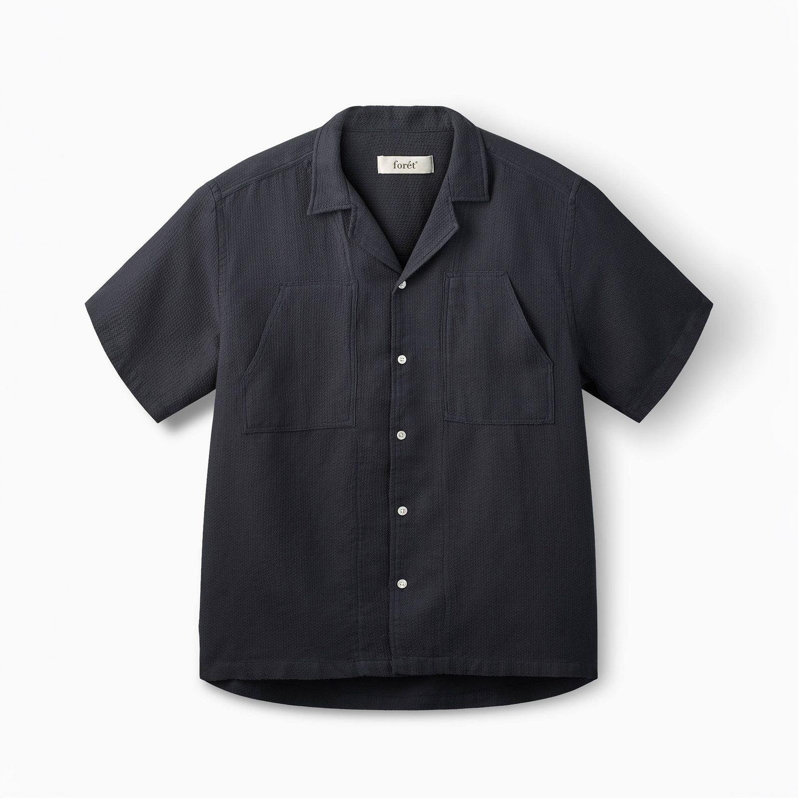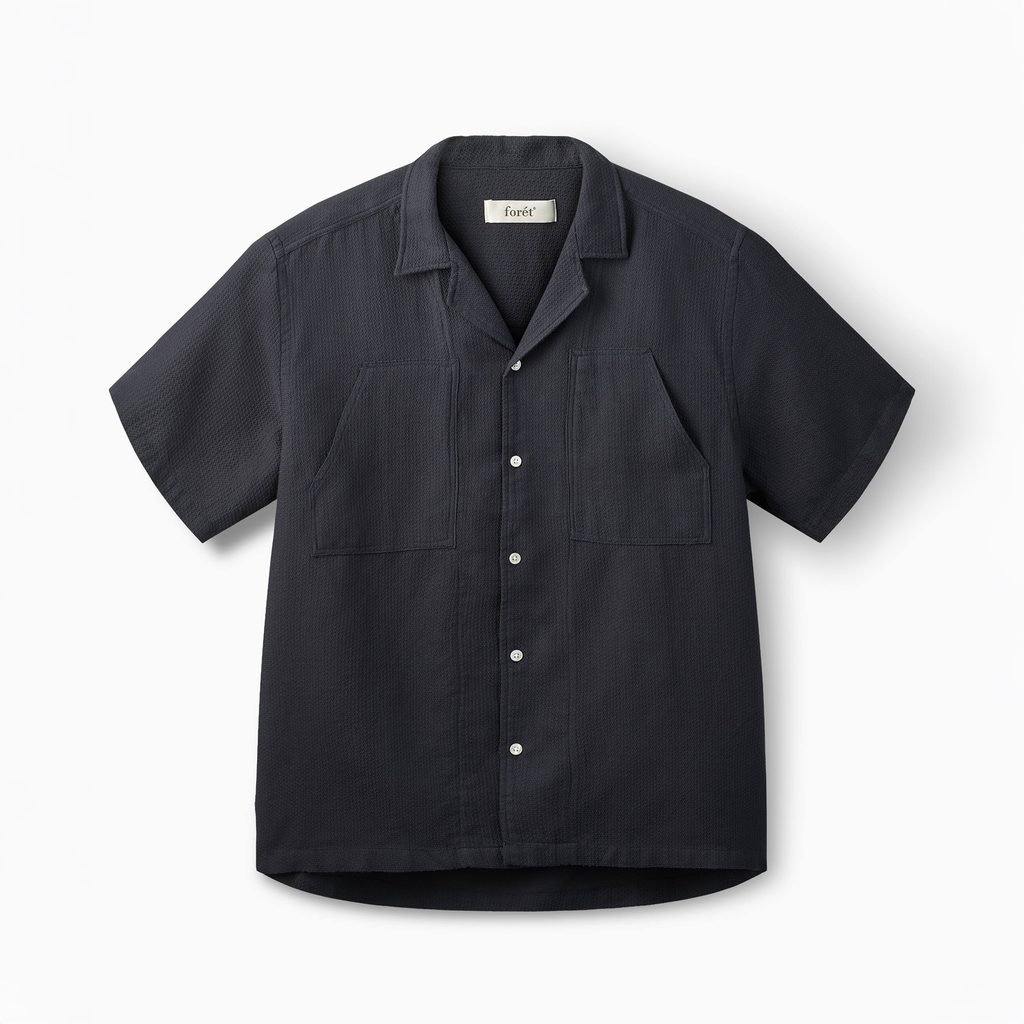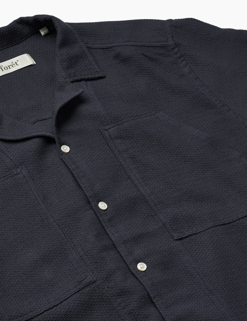 Sommerhemd Lagoon der dänischen Marke Forét aus Bio-Baumwolle, gewebt in Giro Inglese-Technik – einer offenen Bindung mit feinem Rautenmuster, die deutlich luftdurchlässiger ist als herkömmlicher Popeline. Der Stoff hat eine matte Oberfläche und eine feine Textur, die dem Hemd auch in einfarbiger Ausführung Tiefe verleiht. Der Schnitt ist gerade, der Kragen ist ein Camp-Kragen / flach – also niedrig, offen und ohne Verstärkungen. Kurze Ärmel, Knopfleiste; das einzigartige Aussehen wird durch zwei kegelstumpfförmige Brusttaschen ergänzt. Teil der limitierten Saisonkollektion.