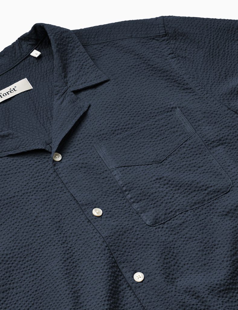 Košile od dánské značky forét z lehké seersucker bavlněné tkaniny s charakteristickým zvlněným povrchem, který vzniká rozdílným napětím nití při tkaní. Díky tomu látka nedoléhá na kůži celou plochou a přirozeně ventiluje – seersucker je proto jedním z nejlepších materiálů do horkého počasí. Navíc ho není potřeba žehlit, protože zvlněný bude tak či tak.