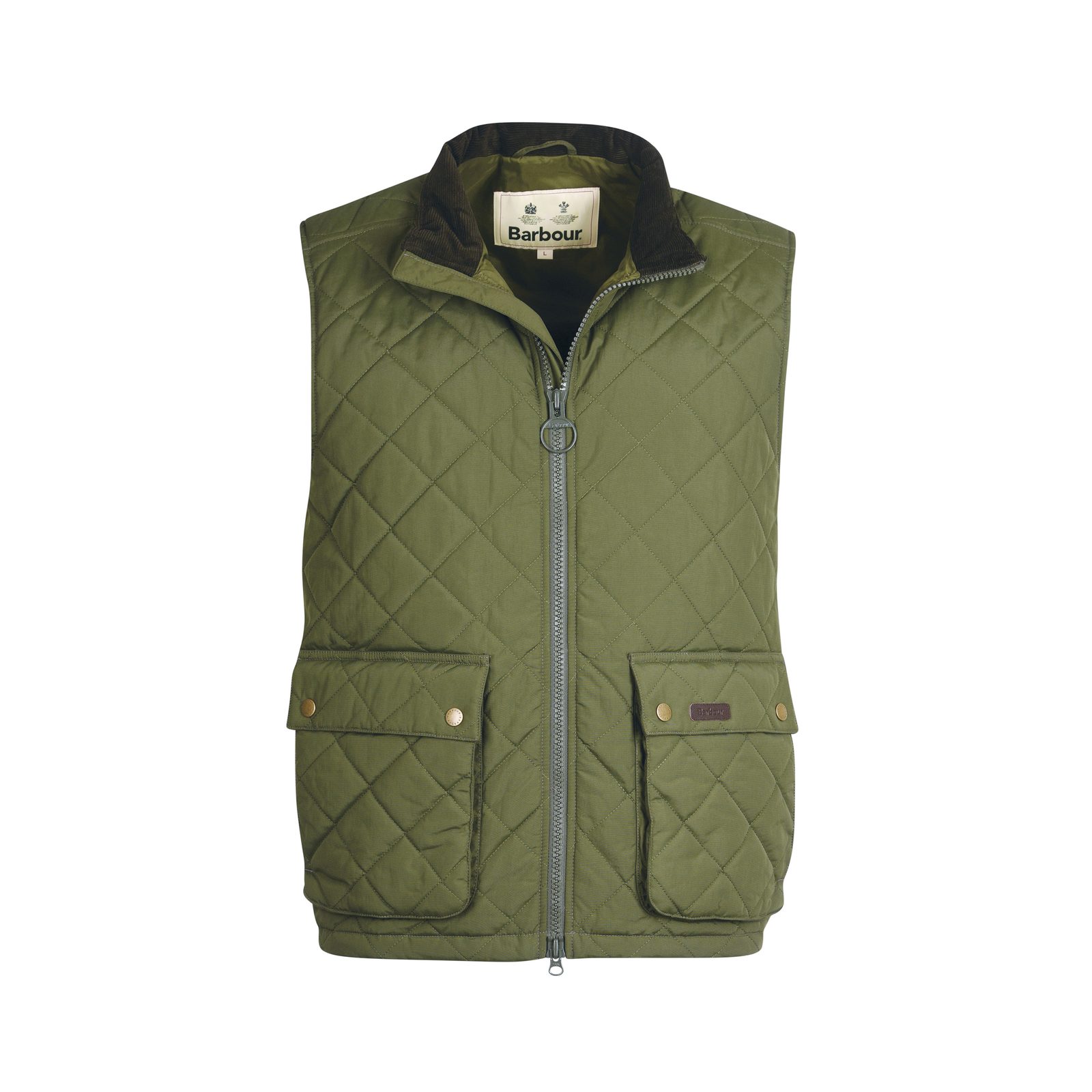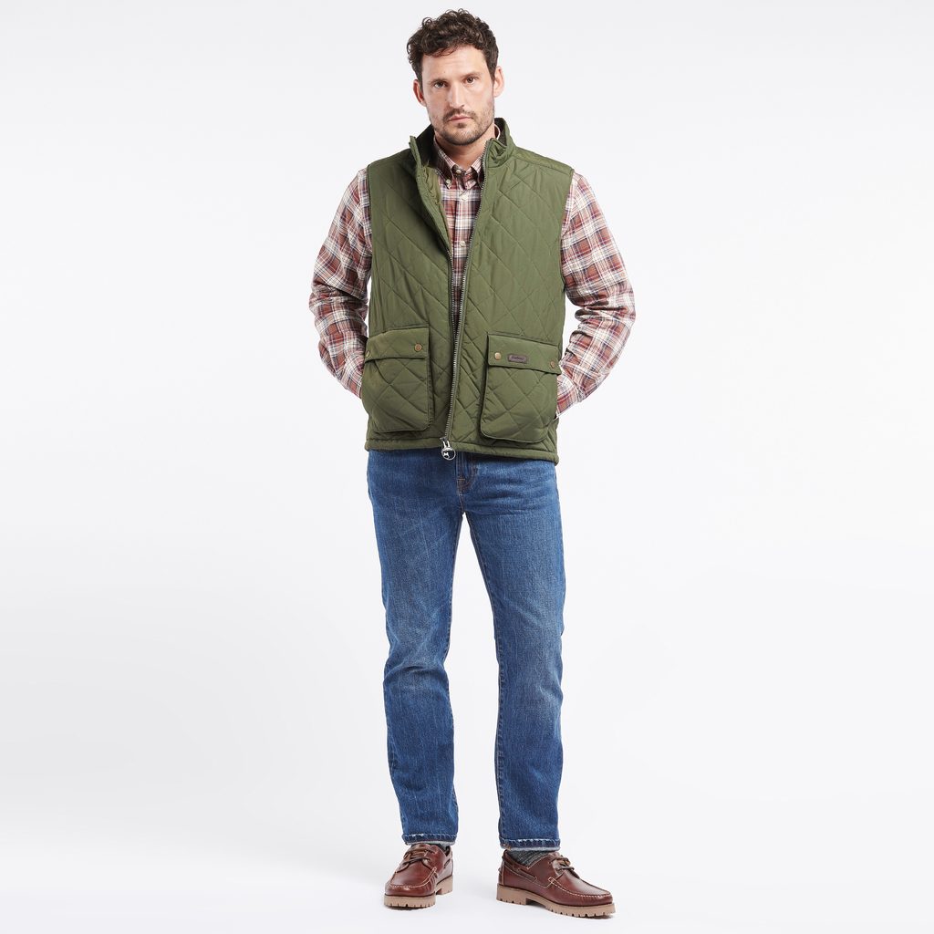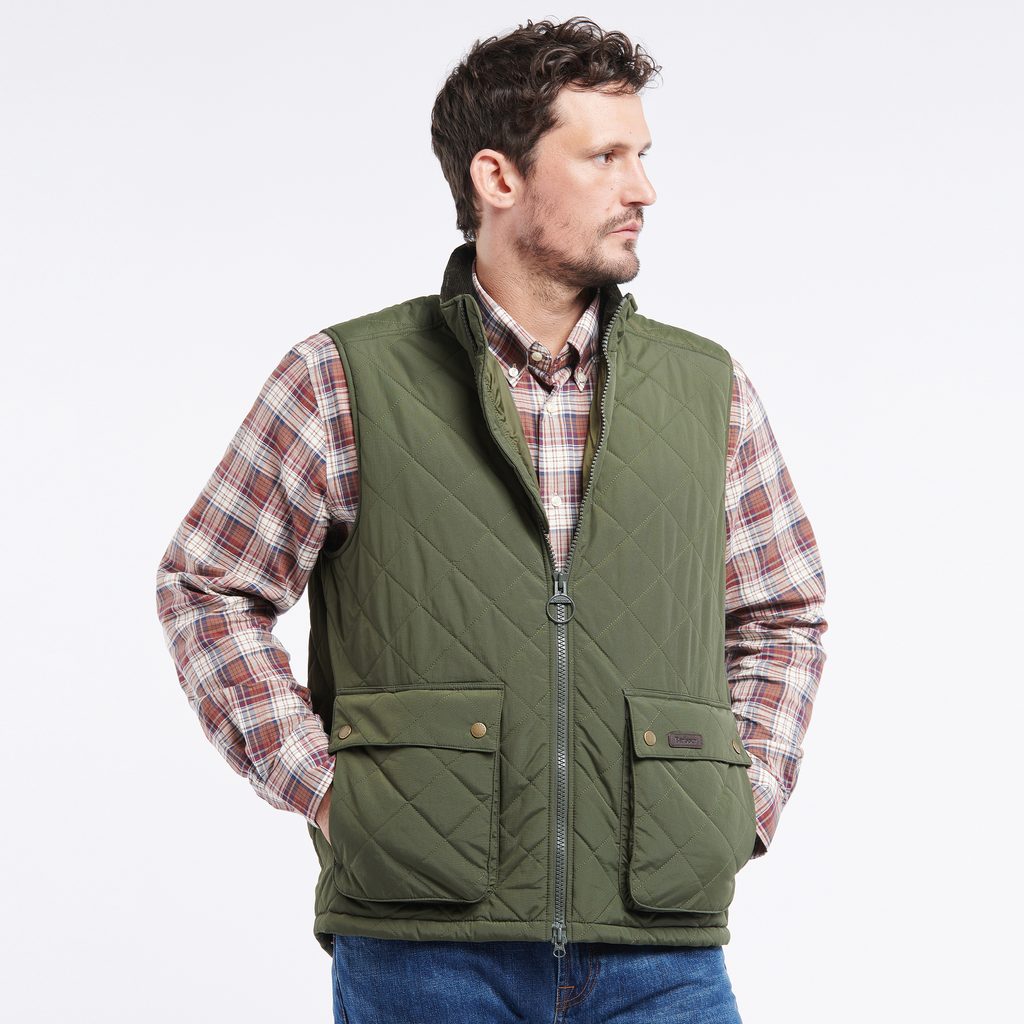 Markante Barbour Fernwood Steppweste mit höherem Stehkragen, doppelseitigem Reißverschluss und zwei geräumigen Seitentaschen mit Druckknopfverschluss. Ein großartiges Kleidungsstück für die Saison, zum Beispiel über einem Pullover oder unter einer klassischen Jacke, je nach Wetterbedingungen.