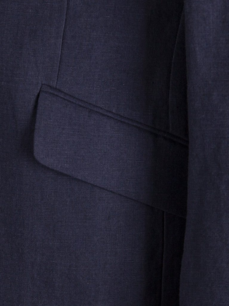Und das Futter ist ein Kapitel für sich. Es ist ein sogenanntes Halbfutter, das heißt, es umhüllt nur die obere Hälfte des Rückens und der Hüften von innen. Die untere Hälfte ist perfekt atmungsaktiv und leicht. Die doppelten Schlitze an den Seiten tragen zur Eleganz des Tages bei.