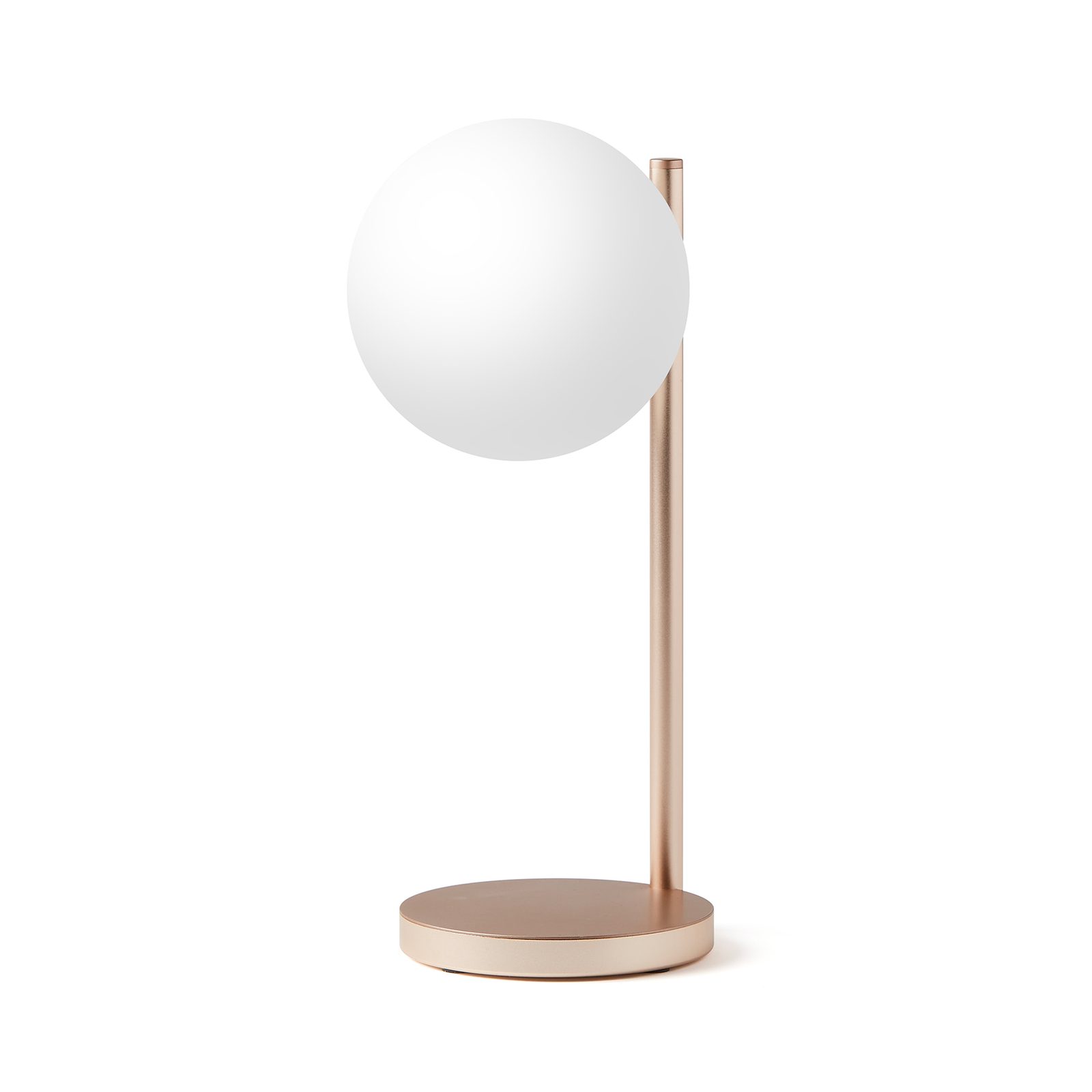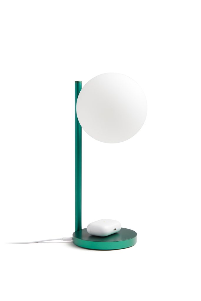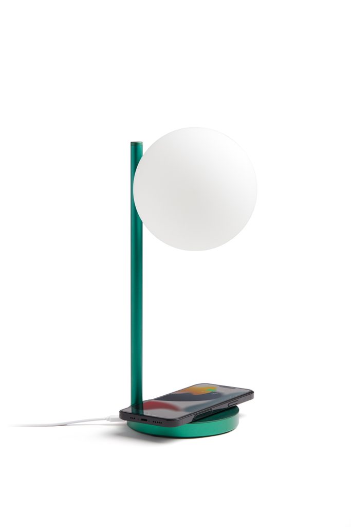 Diese minimalistische Lampe ist wie zwei in einem. Zusätzlich zur Lampe selbst - im Sockel - verfügt sie über ein kabelloses Ladegerät, das kompatible Mobiltelefone oder Kopfhörer mit bis zu 15 Watt Leistung aufladen kann.