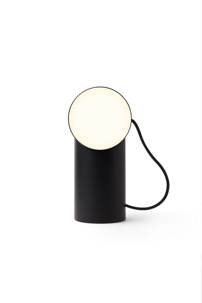Eine futuristische Lampe, die eine abnehmbare Lampe hat. Dank der magnetischen Schicht lässt sich der Kopf am Aufsatz in jede Richtung verstellen. Er kann auch komplett abgenommen und daneben gestellt werden - die Stromversorgung erfolgt über ein geflochtenes Anschlusskabel.