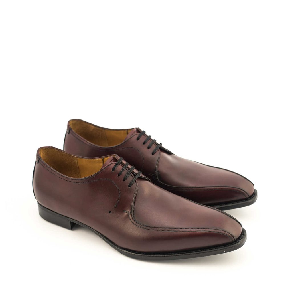 Weniger formelle Derby-Schuhe - d.h. offene Schnürhalbschuhe - mit einer dezenten Naht entlang der Rundung des Spanns. Dank dem sorgfältigen Design, nämlich dem hohen Spann und dem breiteren Teil im Bereich des kleinen Zehs, sind sie äußerst bequem. Sie werden nur aus feinstem französischem Leder gefertigt, hier in Bordeaux.