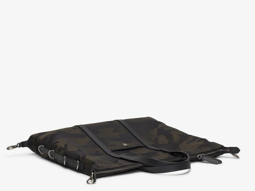 Die Tasche ist in Camouflage-Optik oder in schlichterem Khaki mit schwarzen Details erhältlich.
