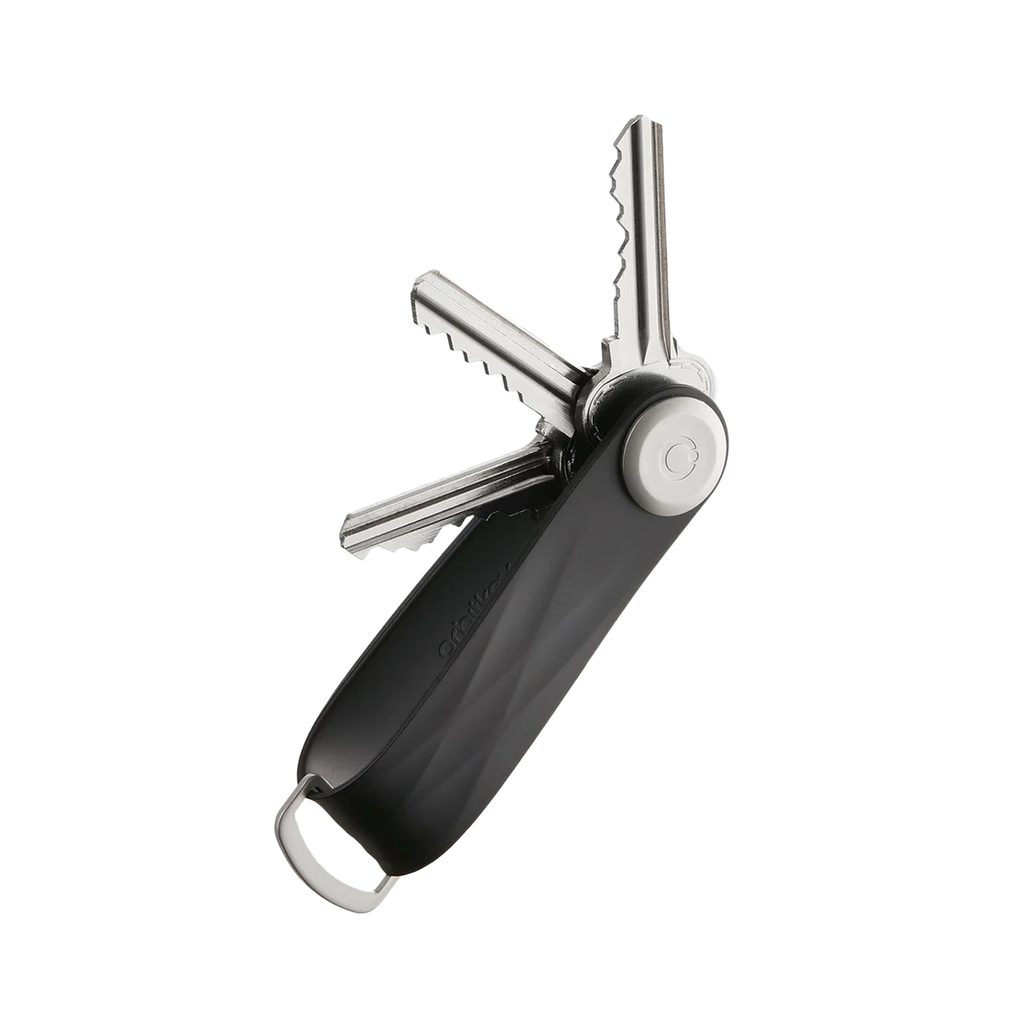 Die zweite, deutlich verbesserte Version des Orbitkey-Schlüsselanhängers. Im Vergleich zum „ersten“ noch dünner, leichter zu handhaben, mit deutlich haltbareren Edelstahlschrauben. Diese sind auch so modifiziert, dass der Schlüsselring mit (fast) allen Arten von Schlüsseln funktioniert. Und weil nicht jeder ein Fan von Leder ist, gibt es diese sportlichere Version aus robustem Polymer.
