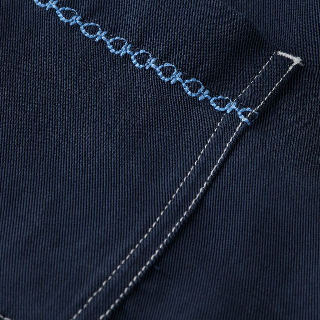 Das klassisch geschnittene Hemd hat lange Ärmel mit klassischer Knopfleiste und einen spitzen, nicht dehnbaren Kragen. Ein besonderer Blickfang ist die vordere Brusttasche, die mit einem leuchtend weißen Stoffstreifen verziert ist.