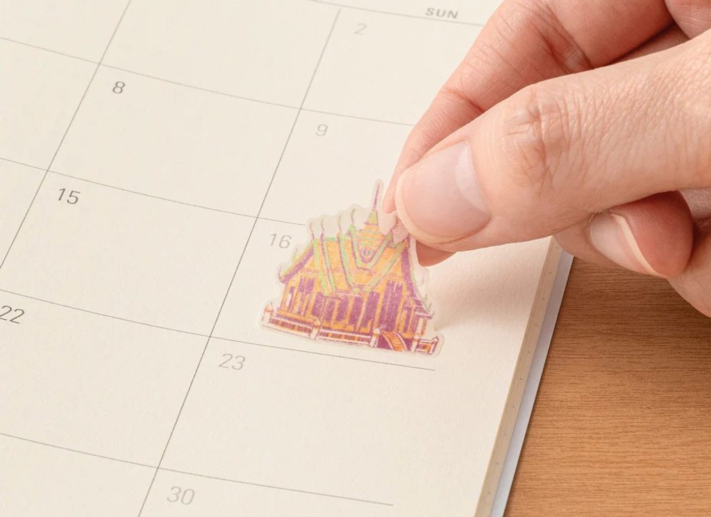 Reisesticker der japanischen Firma Traveler's mit Motiven aus dem fernen Thailand. In der Hauptrolle ein buddhistischer Tempel, traditionelles Chut Thai und Pad Thai zum Probieren. สวย!